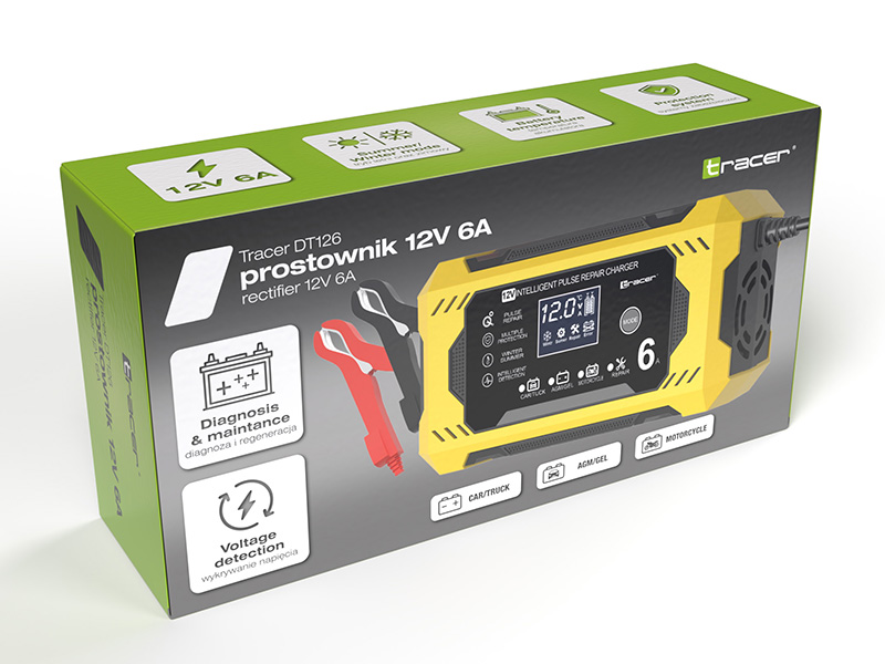 Tracer DT126 nie tylko ładuje, ale również diagnozuje akumulator, oceniając jego aktualny stan techniczny. Wbudowany system potrafi wykryć problemy i poinformować użytkownika o kondycji ogniw. Dodatkowo tryb regeneracji pozwala przywrócić sprawność akumulatorom głęboko rozładowanym lub osłabionym, dzięki czemu możliwe jest ich dalsze bezpieczne użytkowanie.