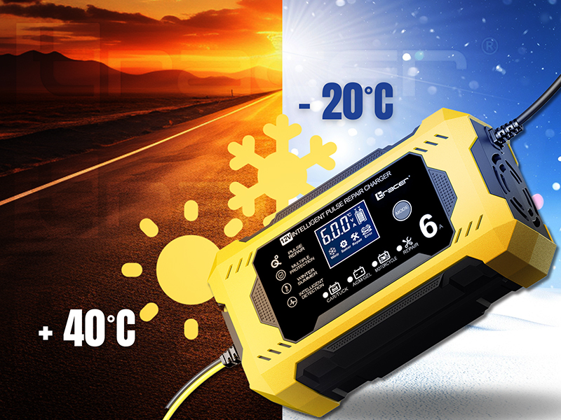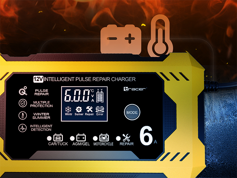 Warunki atmosferyczne mają ogromny wpływ na wydajność i żywotność akumulatora. Prostownik Tracer DT126 oferuje dedykowane tryby letni i zimowy, które dostosowują charakterystykę ładowania do temperatury otoczenia. W niskich temperaturach zapewnia wyższe napięcie, aby skutecznie doładować akumulator, natomiast latem ogranicza je, chroniąc ogniwa przed przegrzaniem i nadmiernym zużyciem.