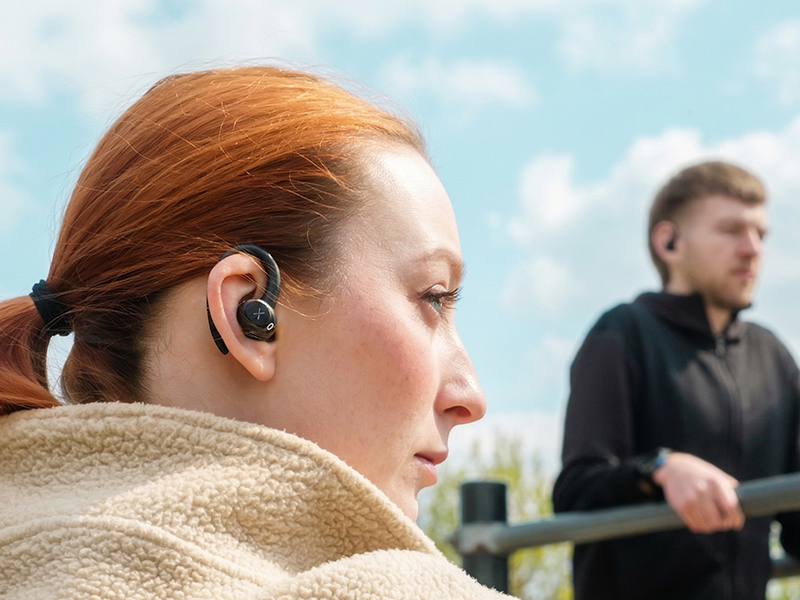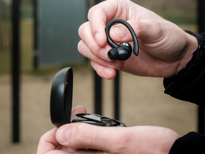 Ergonomiczne zaczepy na uszy zapewniają stabilność nawet podczas intensywnego treningu. Słuchawki nie wypadają i pewnie trzymają się ucha, co pozwala skupić się na aktywności bez konieczności poprawiania ich położenia.